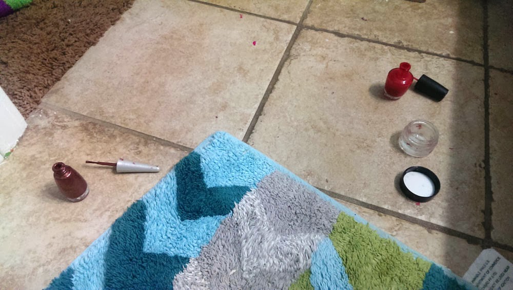 Well, I came home about two hours later (just a pit stop--I went back for a couple more hours). As I sat down to dinner with the family, I noticed that Kate had stuff all over her face (said only in the voice of the lovable "Private Eyes" character). Garry relayed the sordid details of the girls' party in my bathroom. They applied makeup and nail polish--lots and lots of nail polish--all by themselves. Kate was especially adorned, but so were the tile floor, the bathroom cabinets, and the rug. The girls cleaned up pretty nicely, but we can't say as much for the other surfaces, whose sparkly decorations are likely permanent.